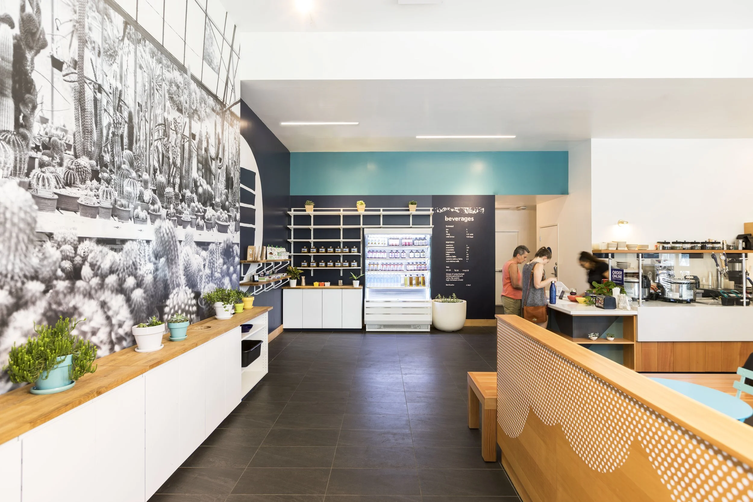 Classic life guard towers of the Southern California coastline cue the atmosphere for this restaurant chain that serves healthy and picture-perfect compilations of fruit + grains. A practical sound problem was tackled by the creation of the “blending chamber” that taps into surf shack iconography. Bold blocks of color swath the space between crisp, clean lines and vintage utilitarian camp with imagery mixed in encouraging customers to explore the wilderness in their own backyards.
