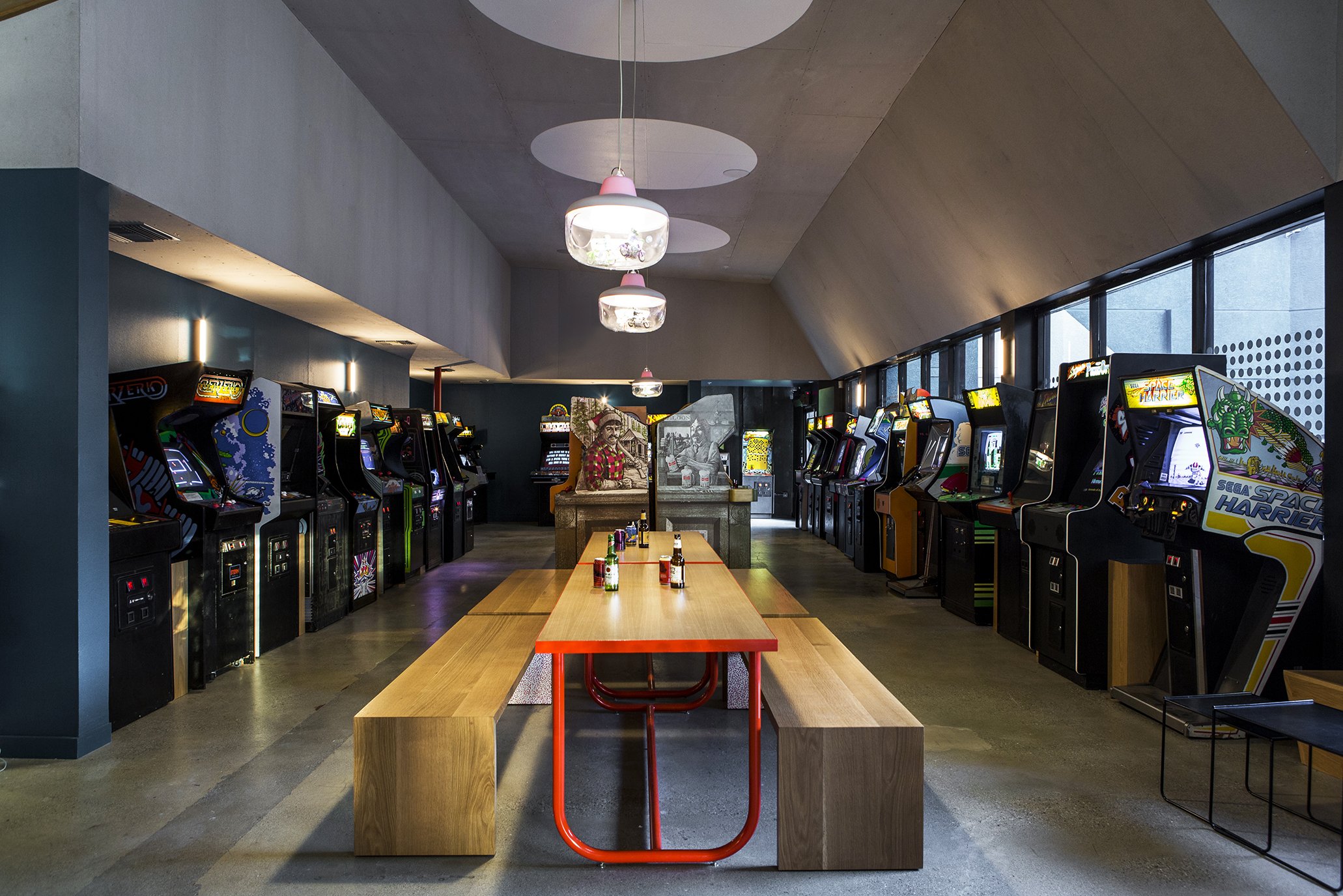 Size: 5,000 sfLocated in an ubiquitous strip mall along Sunset Boulevard in Echo Park, the neighborhood that surrounds Button Mash is rich with varied history and transformative change. Nods to nearby landmarks like the Los Angeles Police Academy mix with “Chinatown” film noir references and intertwine with post-modern design and pop cultural references to create a maximal timeless experience- an Elysian Drift. A kaleidoscopic journey through layers of transparency, reflectivity and pattern pull you in through a portal cut into the strip mall’s exterior, past the hand painted Talavera tiles and round window that bring visitors into an otherworldly tunnel filled with a dense custom wallpaper by artist Joseph Harmon.