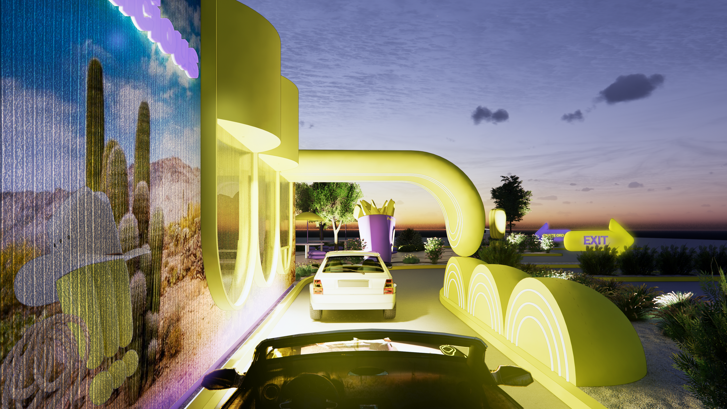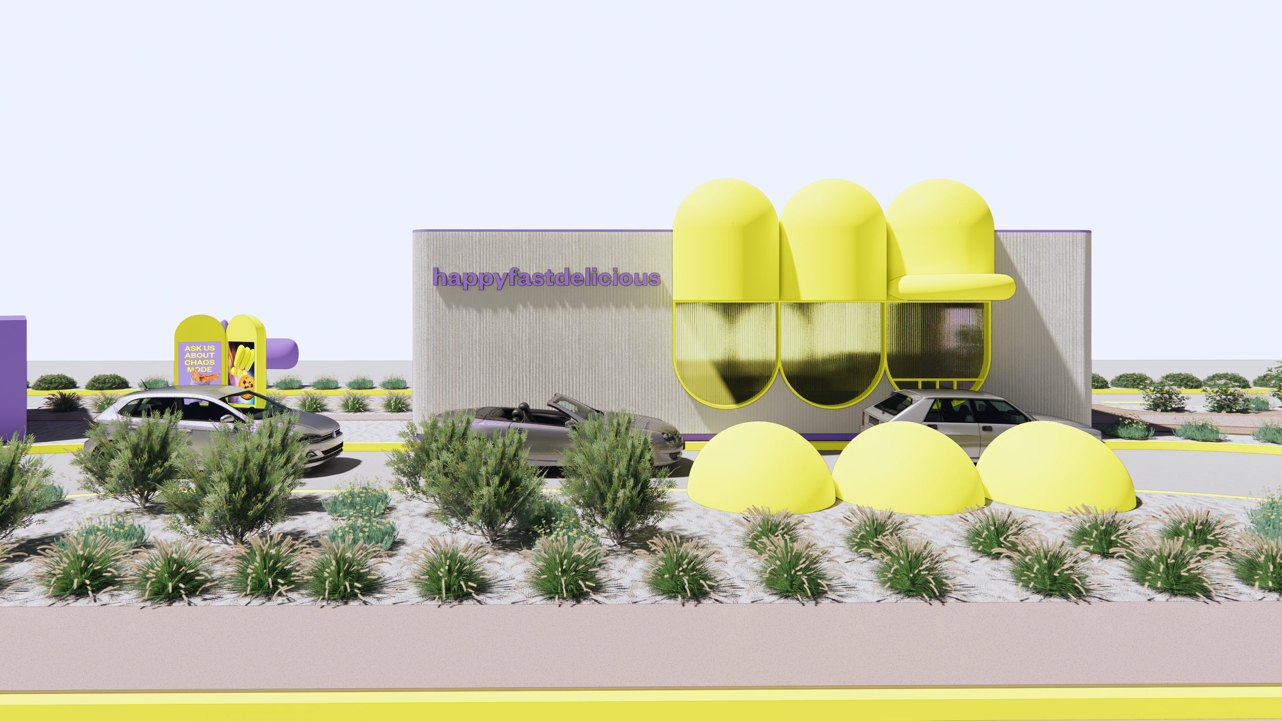 Size: 800-1,600 sfHappy Fast Delicious was created to bring joy and efficiency to the drive through coffee experience. We worked with the founder to design a customer journey and physical presence that matches the energy and fun embodied in the brand. We designed the conceptual spatial protoype and consulted on branding integration for multiple locations. The bold color palette and signage draw smiles and engagement from those driving by. We worked to optimize the siteplan for flow and integration with the ordering app, adding moments of surprise and delight throughout the experience for both cars & pedestrians.